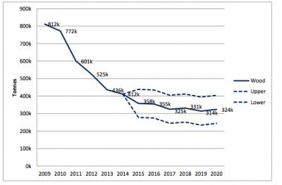 WRAP projections suggest that by 2020 the overall paper and card packaging recycling rate in the UK will rise as high as 85 per cent. Meanwhile the wood rate is expected to decline to 24 per cent in the next four years, though because of the presence of established high value end markets for wood packaging (for example wood recyclers that have good quality wood can send their material to end markets which could pay up to £200 per tonne rather than biomass, which attracts a much lower price per tonne) the recycling rate is falling much slower compared to the previous six years.
