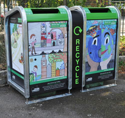 Five new ‘on the go’ recycling bins (including those pictured, right) have been installed as part of the council’s efforts to increase recycling rates (currently around 40 per cent) to reach the EU targets of recycling 50 per cent of waste by 2020.